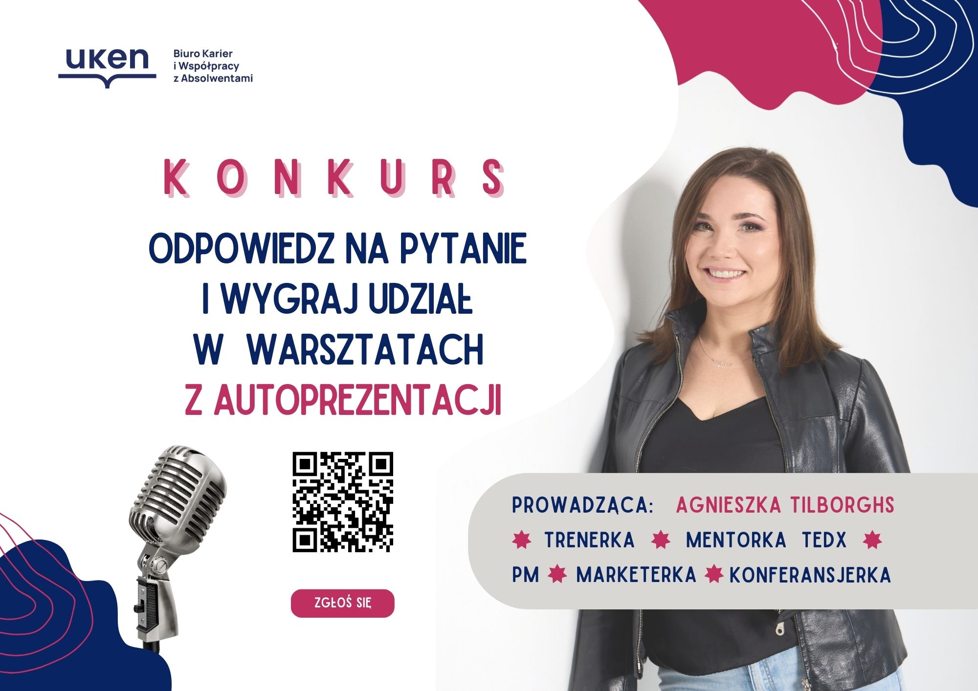 Biuro Karier i Współpracy z Absolwentami UKEN zaprasza do udziału konkursie, w którym można wygrać miejsce na bezpłatnych, intensywnych warsztatach: Autoprezentacja, która działa – jak mówić o sobie jasno, z pewnością i z wpływem.